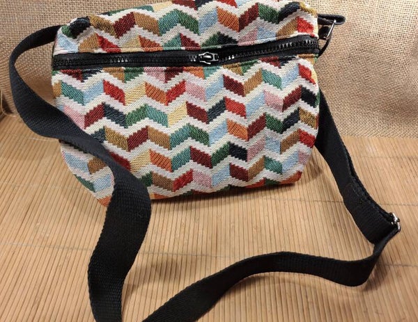 Sac à bandoulière noire réglable. Tissu jacquard à l'extérieur et coton fleuri pour l'intérieur. 3 poches fonctionnelles, fermeture noire.