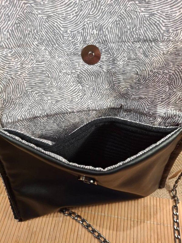 Pochette en simili cuir noir et python jaune . Intérieur velours côtelé noir et coton gris motif empreintes.