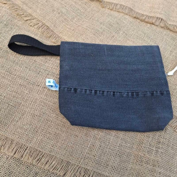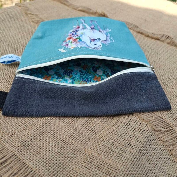 Extérieur avec une face coton bleu motif appliqué Crin Blanc, et une face en jean gris foncé, fermeture zippée couleur écrue, sur la face illustrée, avec une poignée d'accroche noire.