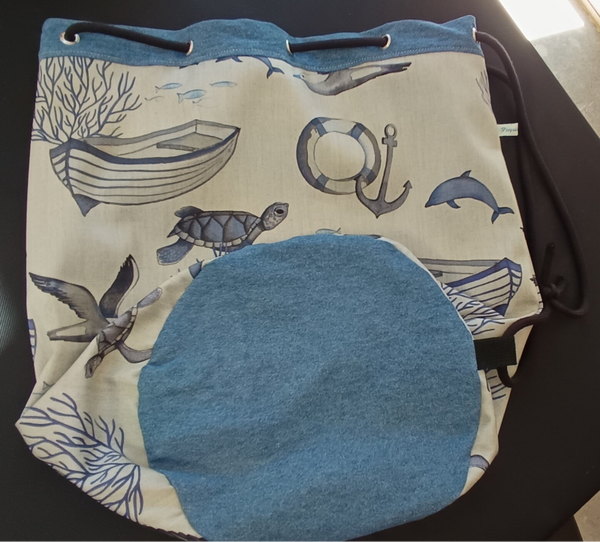 En tissu bachette gris clair avec motifs Marins bleu/gris. Fond de sac et rebord en Jean denim. Entièrement doublé en polyester blanc imprimé coquillages et corail. Corde noire coulissante, oeillets argentés.
