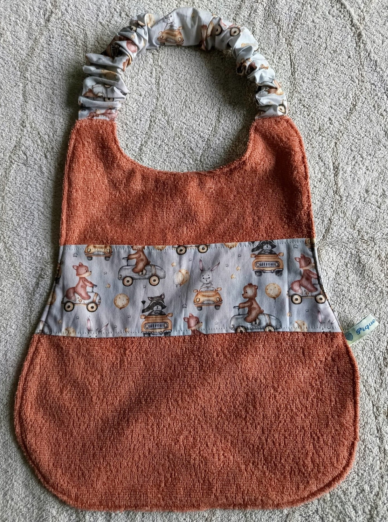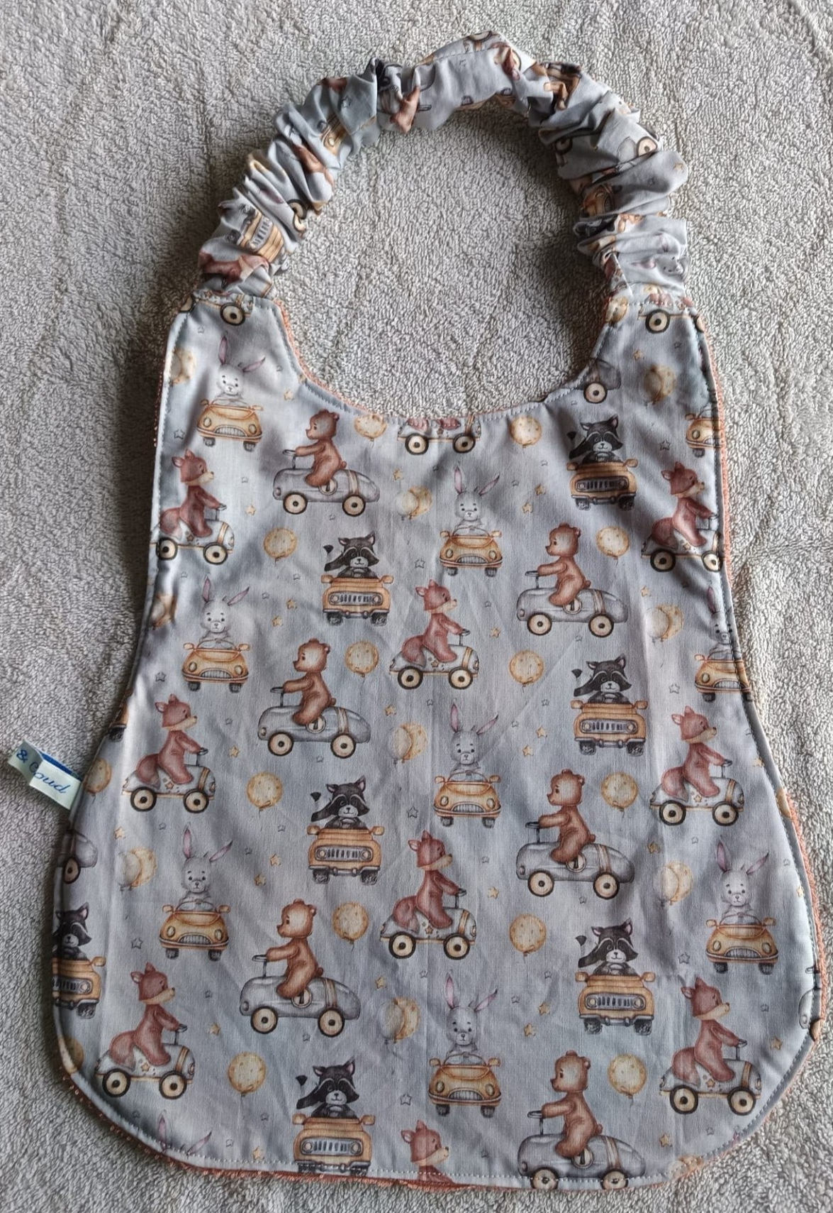 En coton éponge et coton gris imprimé bébés animaux en voiture. Doublé coton assorti. Tour de cou tissu élastiqué.