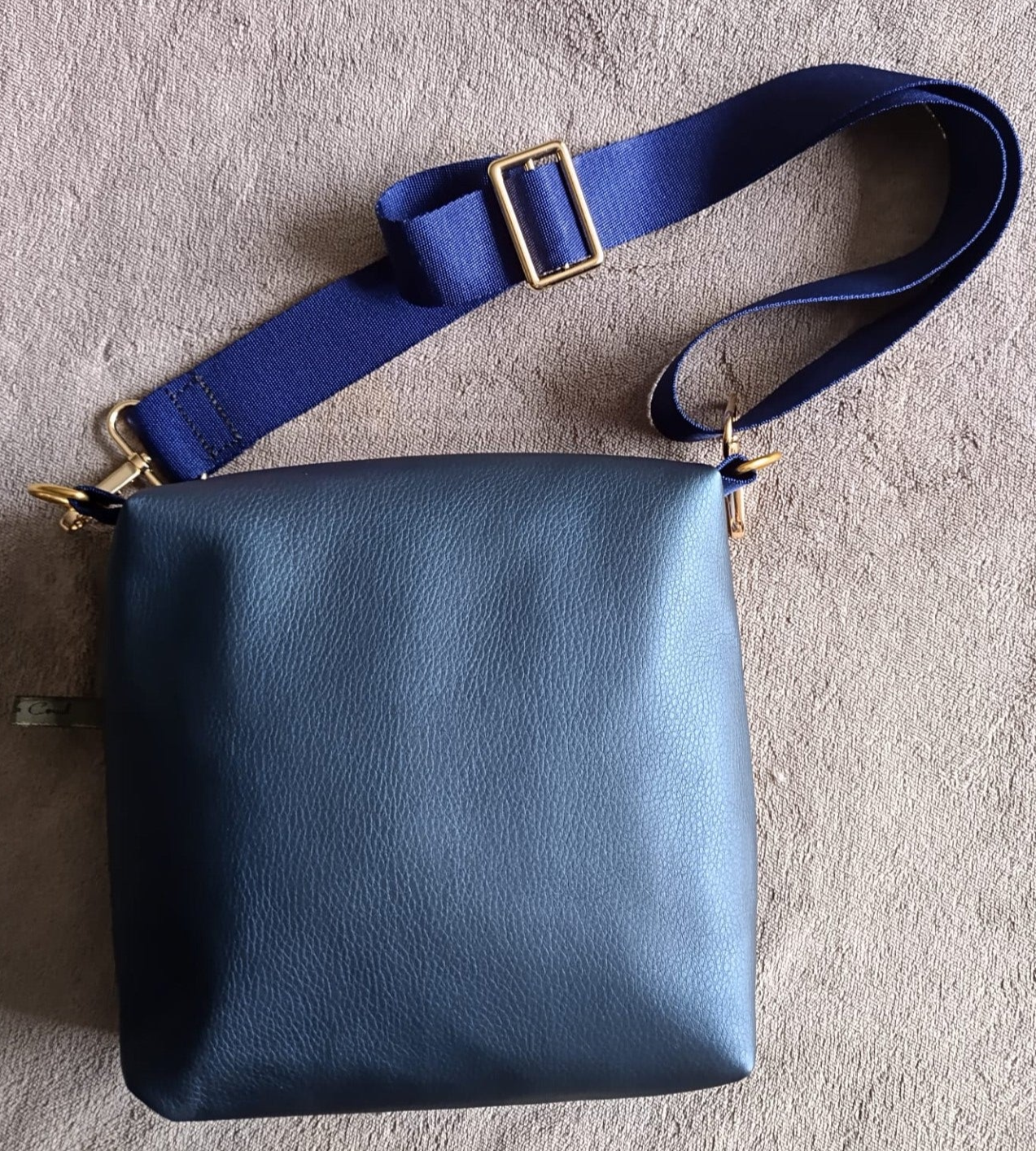 En simili cuir bleu métal, ganse cousue dorée/verte en face avant. Doublure coton fleuri et kaki. 2 poches intérieures. Fermeture par zip doré. Sangle bleu amovible de 3,5 cm, réglable de 60 cm à 105 cm.