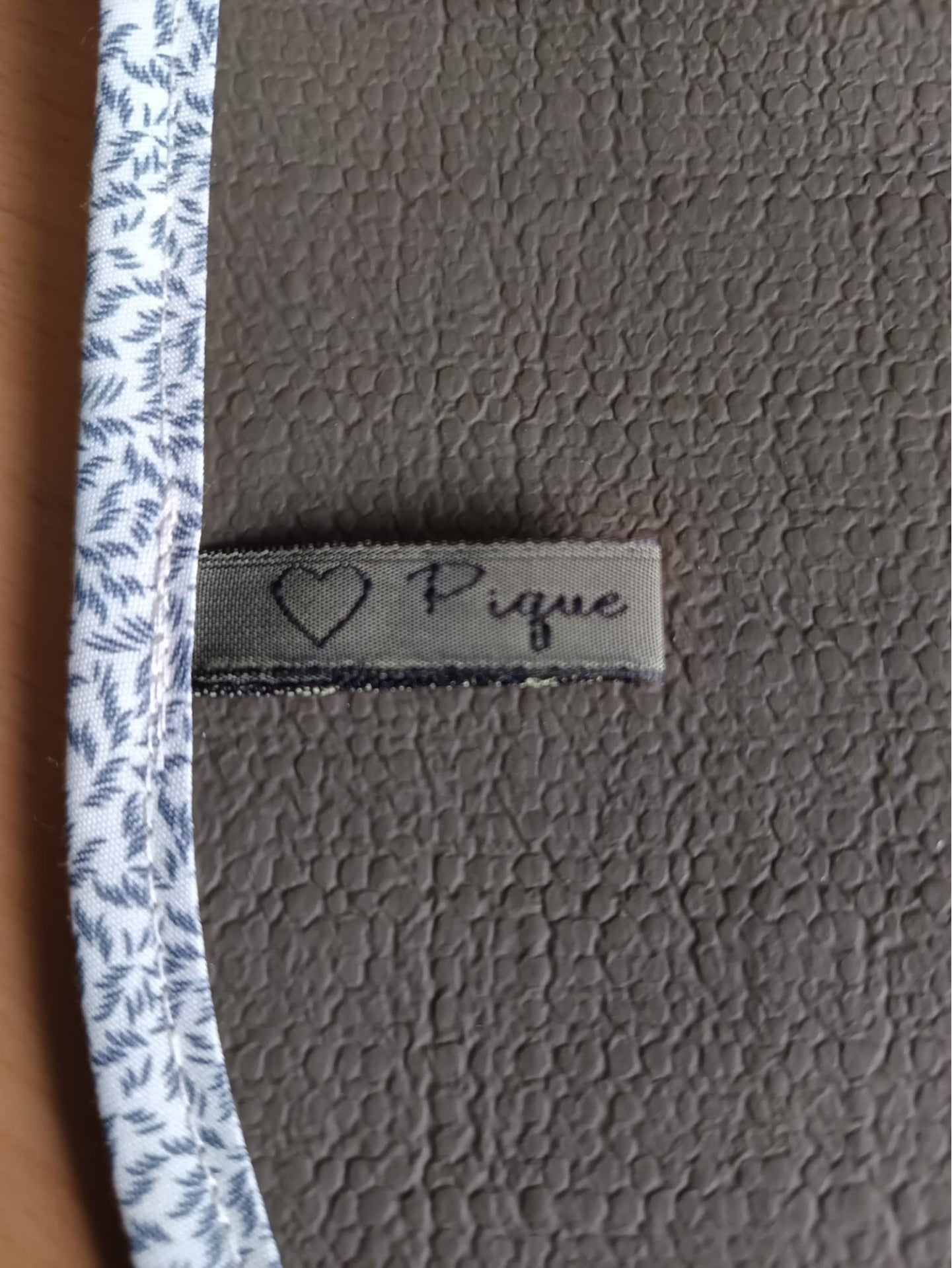 En toile enduite imperméable de couleur marron/vert foncé.Capuche assortie. Fermeture du col par pression métal. Biais blanc motifs feuilles grises cousu sur tout le bord.