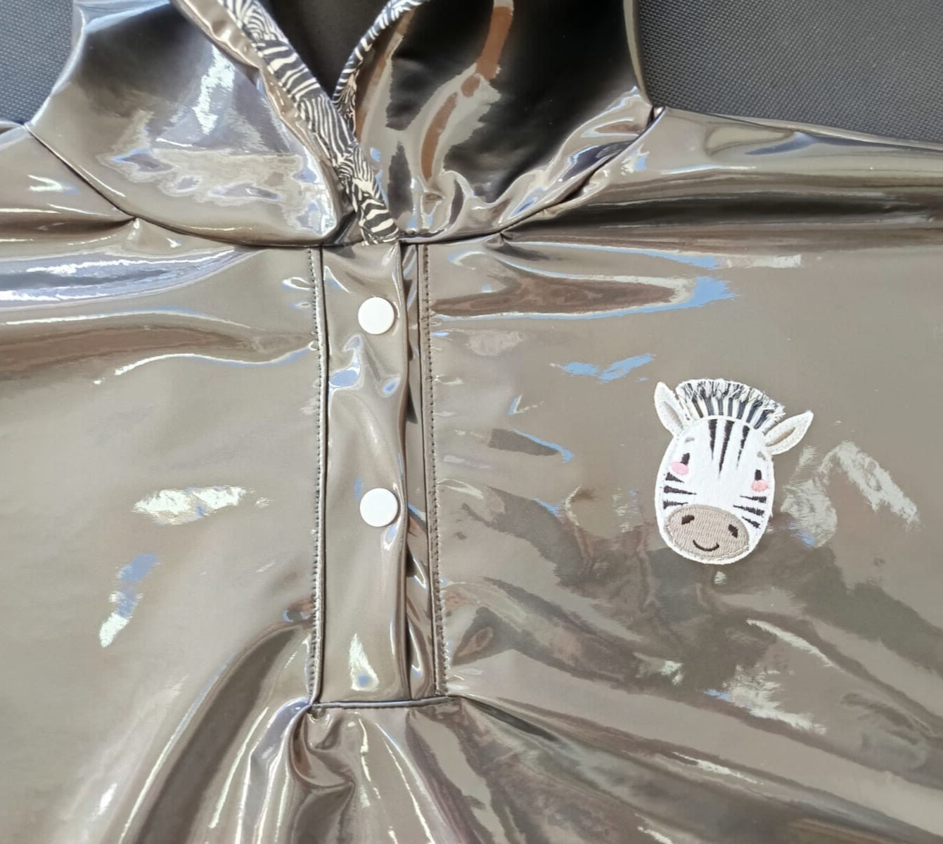 Cape de pluie/poncho en tissu softshell imperméable noir. Ecuson zèbre mignon, biais motifs zebrés. Fermeture du col par 2 boutons pression blancs.