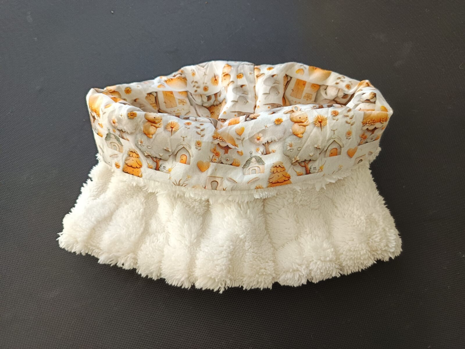 En tissu polaire beige effef tricot et tissu coton imprimé beige motifs lapins, cabanes et forêt.